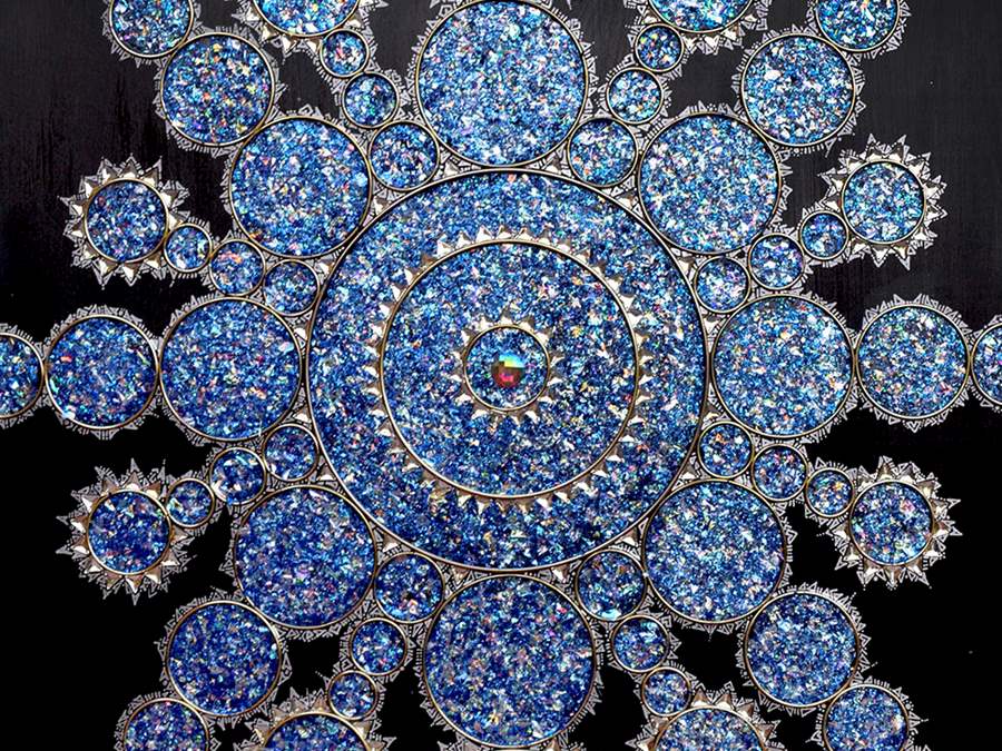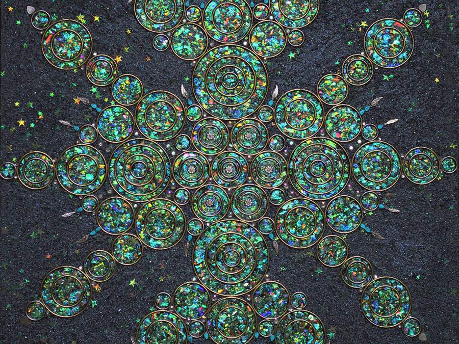 Semi-precious gems, metal, crystal, and acrylic on board.